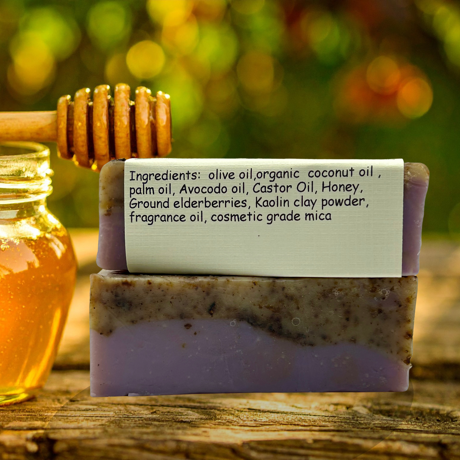 Olive oil, organic coconut oil, palm oil, avocado oil, castor oil, honey, ground elderberries, kaolin clay powder, fragrance oil (phthalate-free), cosmetic-grade mica.
